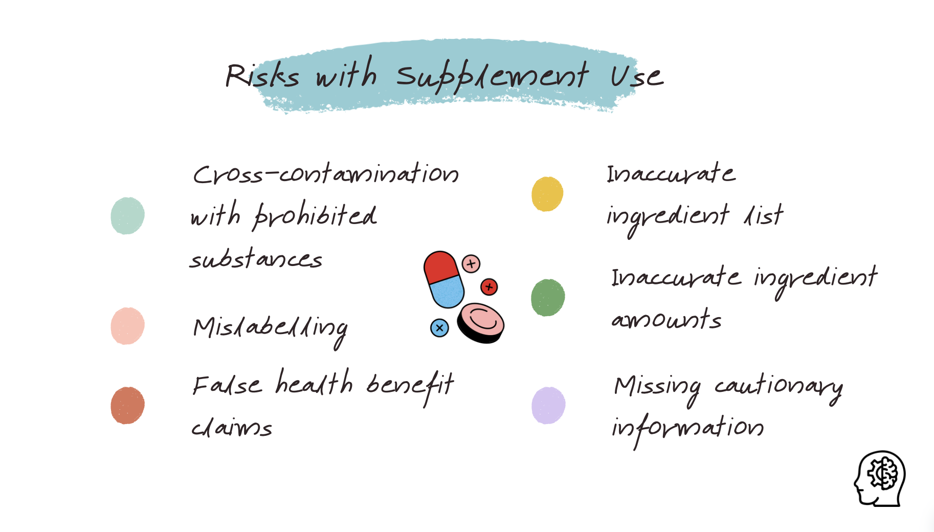 Contrary to the food and drug production, the supplement industry has very little government regulation and poses unique risks to consumers. With little regulation and testing, this poses more opportunity for false claims, contamination, mislabelling, and more. The image below shows some of the many risks with supplement use.