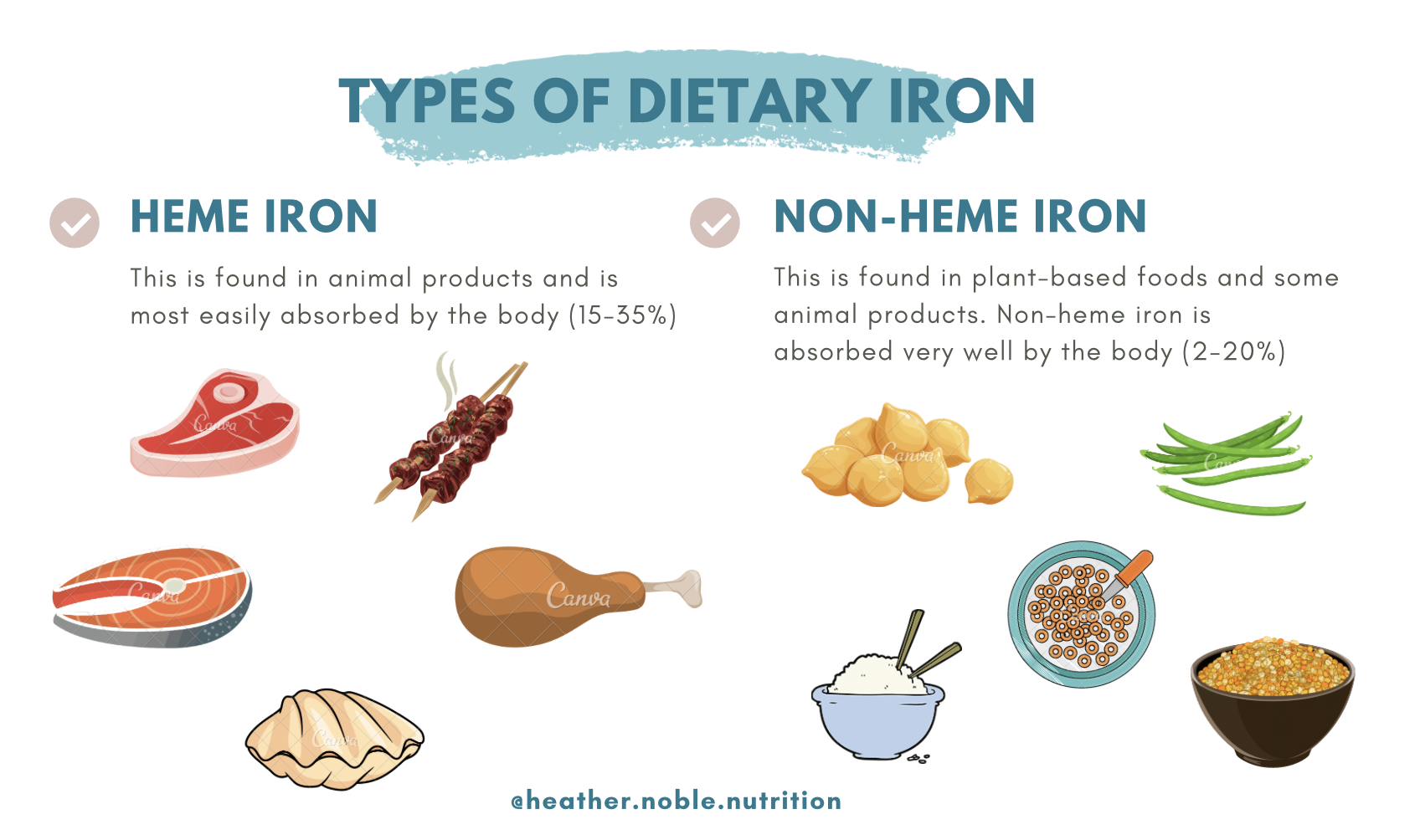 Figure 1: Heme and non-heme are the two types of iron. Our bodies only absorb a very small fraction of the iron we actually ingest; however, heme iron is absorbed better than non-heme iron. Heme iron is found in animal products only and non-heme iron is found in some plant-based and animal products